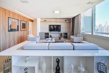 Ambientes sociais integrados, cozinha americana com churrasqueira, ampla sacada com linda vista panorâmica e espera para lareira.